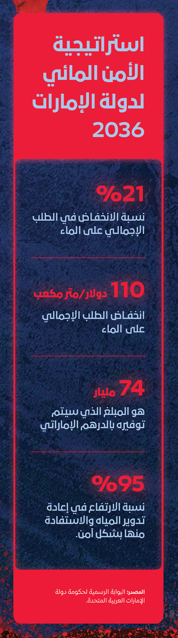 “وقال أثول: “إذا أغلقت محطات التحلية في دولة الإمارات، ستتوقف إمدادات المياه بشكل كبير ولن يكون هناك سوى كمية محدودة من المياه المخزنة في شبكة توزيع المياه والتي ستكفيك لمدة يوم أو يومين. وبصفة عامة، فإن الماء الوحيد المتوفر هو الماء الموجود في شبكة توزيع المياه التي تنقلها من محطة التحلية إلى المنازل”.