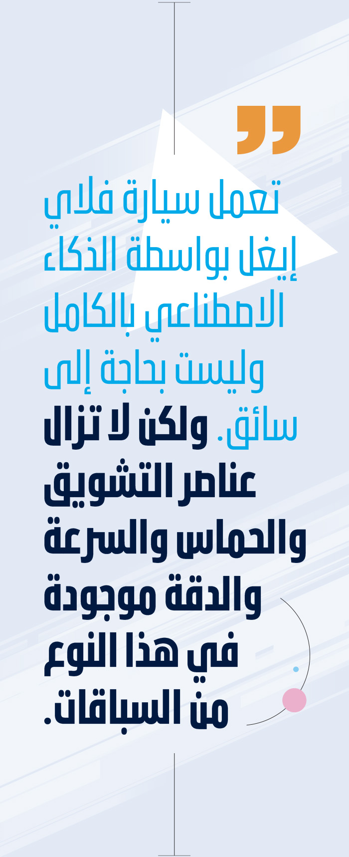 قال توم مكارثي، المدير التنفيذي لشركة أسباير التي تمثّل المؤسّسة المعنيّة بالتحول التكنولوجي في مجلس أبوظبي للبحوث التكنولوجية: “لا يعني عدم وجود إنسان يقود السيارة أنها لا تعتمد على العنصر البشري لأن الأفراد هم من يتولون مهمة القيام ببرمجة سيارات السباق هذه”.